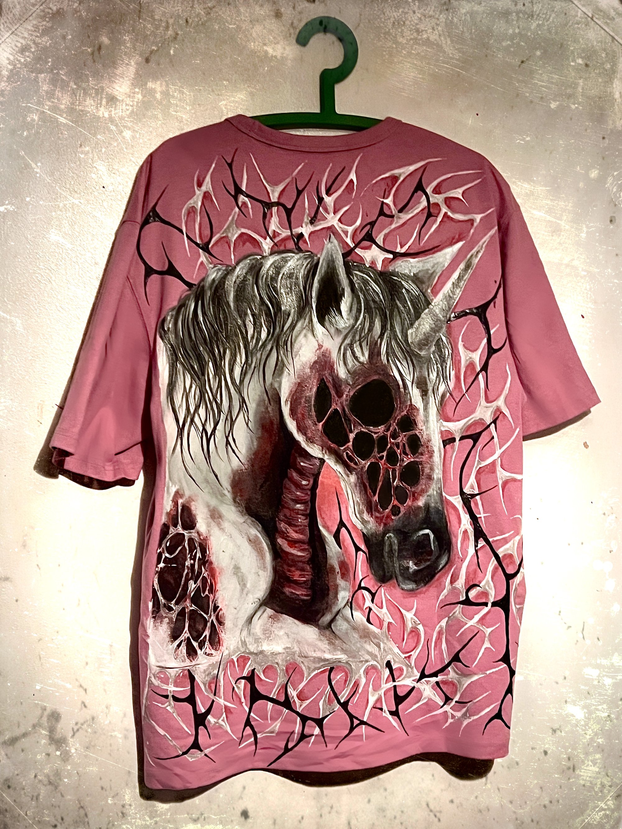 Large Pink T-Shirt. Handpainted Unicorn Design.